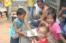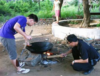 在三教村,志愿者受到了當(dāng)年解放軍進(jìn)城的待遇。由于小學(xué)在施工不便住宿,村民便打開(kāi)自家新裝修的房子請(qǐng)隊(duì)員們住。接著隊(duì)員們到露天廚房大展身手,灶臺(tái)是由幾個(gè)石頭和一個(gè)大鐵鍋搭建而成。指導(dǎo)老師看大家興致高,也過(guò)來(lái)起火,燒柴。有天傍晚,烏云密布,眼瞅著雨就要掉下來(lái),為了能讓志愿者們下雨前吃到飯,熱心的村民為志愿者們買(mǎi)醬料,給他們燒起了飯。