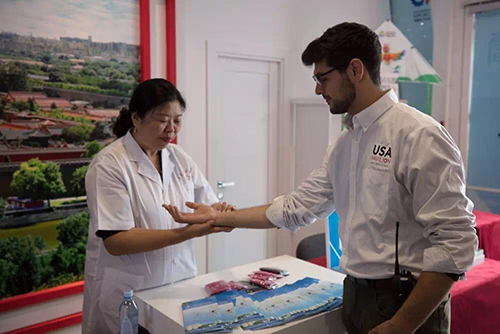 當(dāng)薩仁在中國館尾廳進(jìn)行綠色中醫(yī)針灸展示時,不時有好奇的游客上來體驗。一位在中國館交流的美國館志愿者也想親身體驗中醫(yī)針灸。短暫的號脈后,薩仁說:“這小伙子體格很好,就是手腳會在冬天發(fā)涼!闭f著便幫美國館志愿者進(jìn)行舒解經(jīng)絡(luò)的治療。