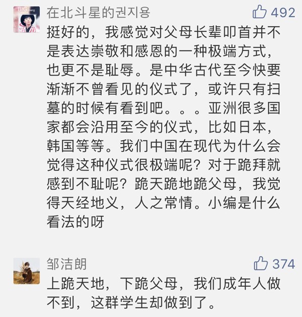 此類“跪拜感恩儀式”此前也多次見諸媒體。有人認(rèn)為憑借“跪拜父母”這樣一個古樸而鄭重的形式,可以倡導(dǎo)日益淡薄的感恩文化回歸,也有網(wǎng)友認(rèn)為“孝道在心,不在做秀”,或從人格養(yǎng)成方面評論:“跪拜禮抹殺了獨(dú)立人格”。