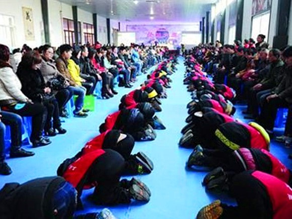 上海某民辦學(xué)校舉辦“孝敬文化節(jié)”“校園集體跪拜孝敬父母”場景(圖片源自網(wǎng)絡(luò))