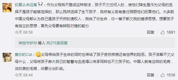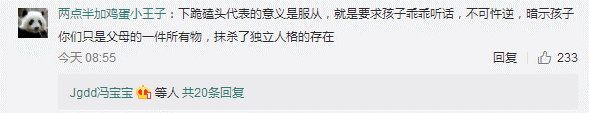 網(wǎng)友“兩點(diǎn)半加雞蛋小王子”:下跪磕頭代表的意義是服從,就是要求孩子乖乖聽話,不可忤逆,暗示孩子你們只是父母的一件所有物,抹殺了獨(dú)立人格的存在。
