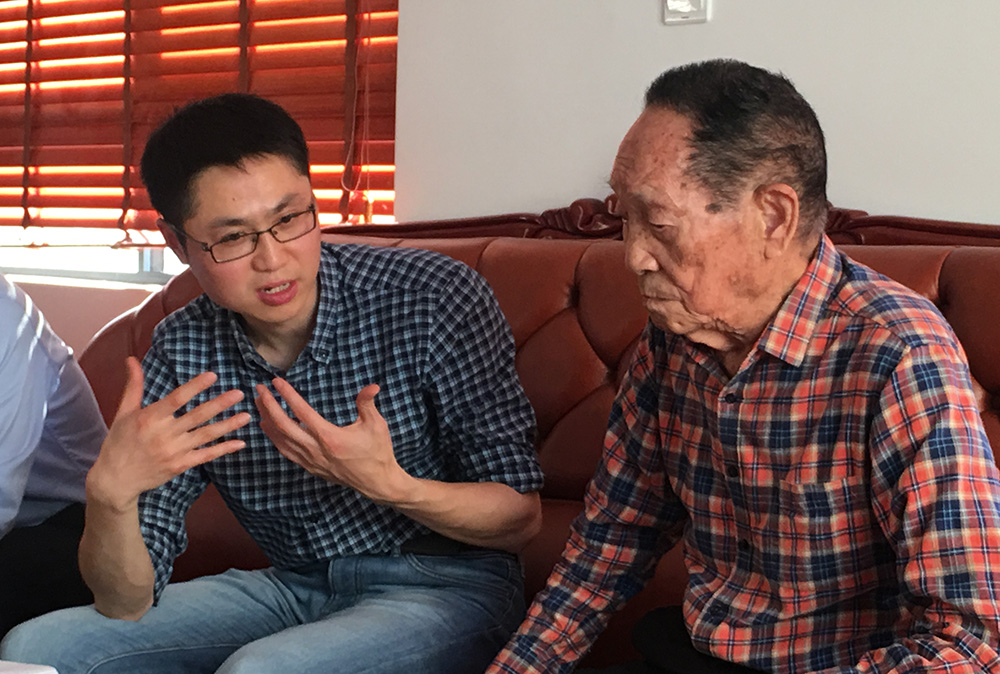 王克劍向袁隆平院士匯報科研進展。受訪者供圖