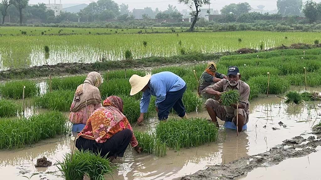 龍春久教授(中)與巴基斯坦當?shù)剞r(nóng)民在拉合爾隆平南亞種子研發(fā)中心試驗田里忙碌著。(人民網(wǎng)記者 周晶攝)